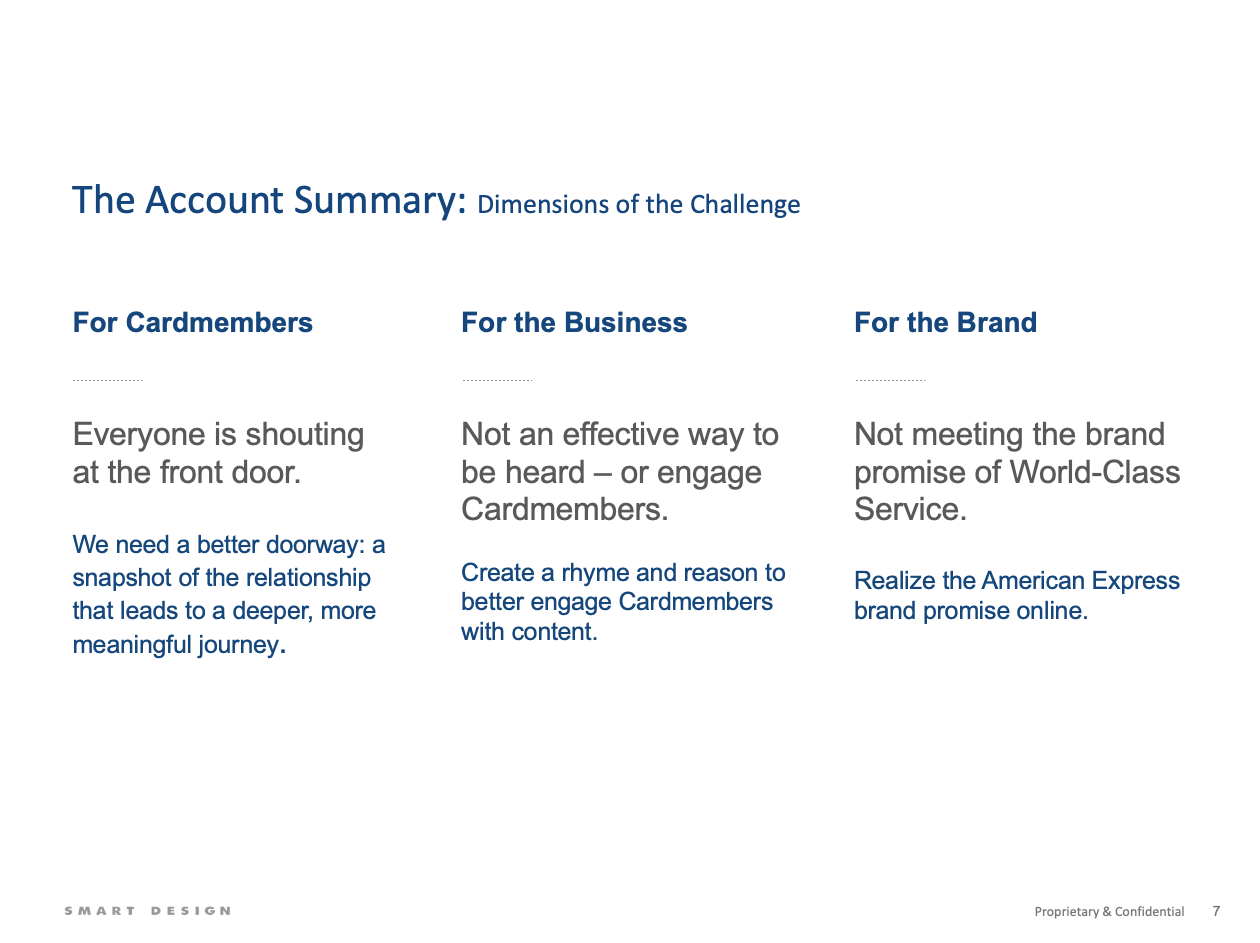 The My Account Page (MYCA) is the landing page every Amex member sees after logging into their account. It’s the main point of engagement for over 100M cardmembers. Yet, most cardmembers ignored the page. They logged in, checked their balance, paid their bill and left. Worse they gave the page low marks in surveys. The Amex team reached out to Smart Design for help.